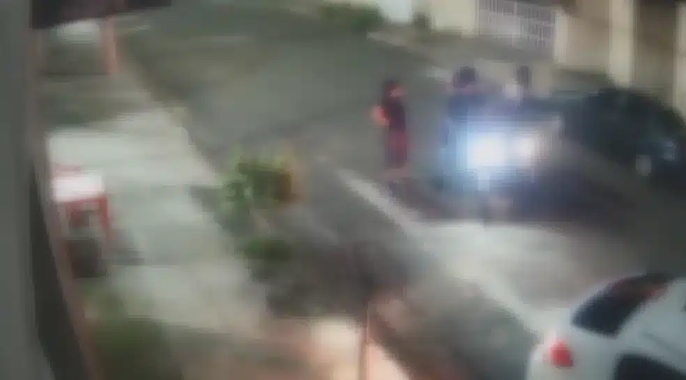Pouco depois, uma mulher sai e cumprimenta as duas vítimas que estavam na moto. Em seguinda, uma outra moto vira na rua, dois homens descem e rendem as vítimas. Em poucos segundos, os ladões saem do local, cada um em uma moto, e fogem.