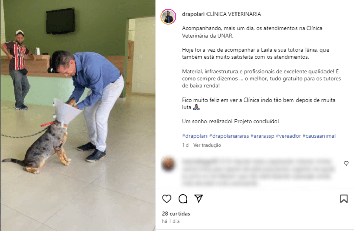 Nesta semana o vereador Dr. José Roberto Apolari publicou um vídeo em suas redes sociais acompanhando, mais um dia, os atendimentos na Clínica Veterinária da UNAR. “Hoje foi a vez de acompanhar a Laila e sua tutora Tânia, que também está muito satisfeita com os atendimentos”, disse