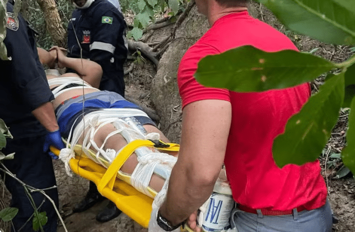 Segundo o Samu, o rapaz fraturou a perna após pular de uma altura de cinco metros na cachoeira. A vítima conseguiu ligar para a família, que acionou o resgate.