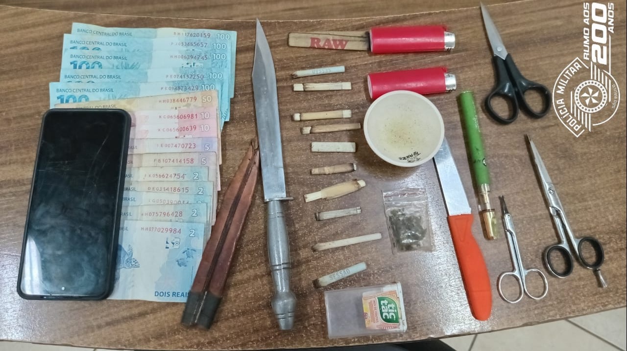 Com o adolescente de 17 anos, também abordado, foi localizado um soco inglês. Ambos foram conduzidos à Central de Polícia Judiciária (CPJ), onde foi registrado boletim de ocorrência por porte de drogas e porte de arma branca.