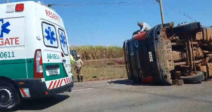 Na manhã desta quinta-feira (15), um grave acidente foi registrado na estrada que dá acesso à Usina São João, em Araras, SP. Um caminhão carregado com cana-de-açúcar acabou tombando ao tentar fazer a rotatória no local.