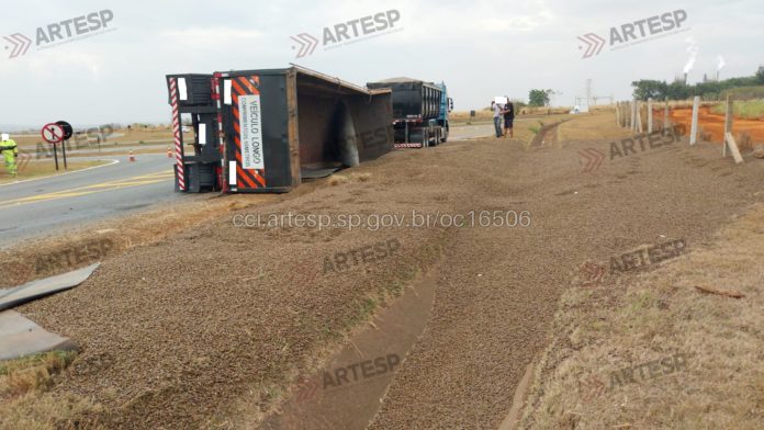 Uma carreta Volvo/FH540 carregada com quase 50 toneladas de ração tombou na tarde desta terça-feira (16), em uma alça de acesso da rodovia SPD 052/191, no município de Araras (SP).