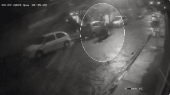 O vídeo mostra que pouco depois das 18h, o homem passa pelo bairro Nossa Senhora das Dores. Primeiro ele chega perto da moto e sai.