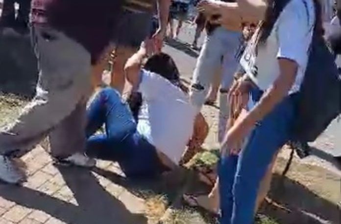 O vídeo mostra o homem agredindo a menor com um capacete repetidas vezes e ela caindo no chão. Outros alunos incentivam a briga e uma pessoa tenta ajudar. Ele também chuta a adolescente. A menina se levanta, anda alguns metros e depois cai no chão, desmaiada.