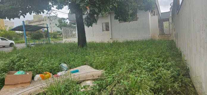Um espaço que faz parte do ESF está tomado por mato e acumulando lixo, incluindo caixas de papelão, vasilhas e até mesmo um colchão.