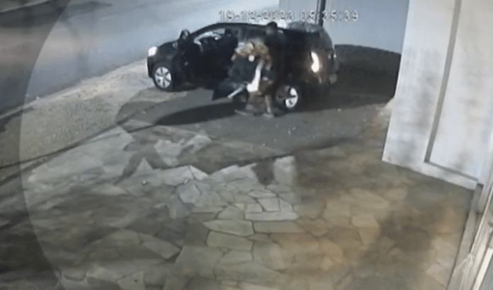 Imagens da câmera de segurança externa da loja mostram que um dos homens se aproxima do estabelecimento e tenta arrombar o portão, mas se afasta. Momentos depois, ele volta e joga um objeto.