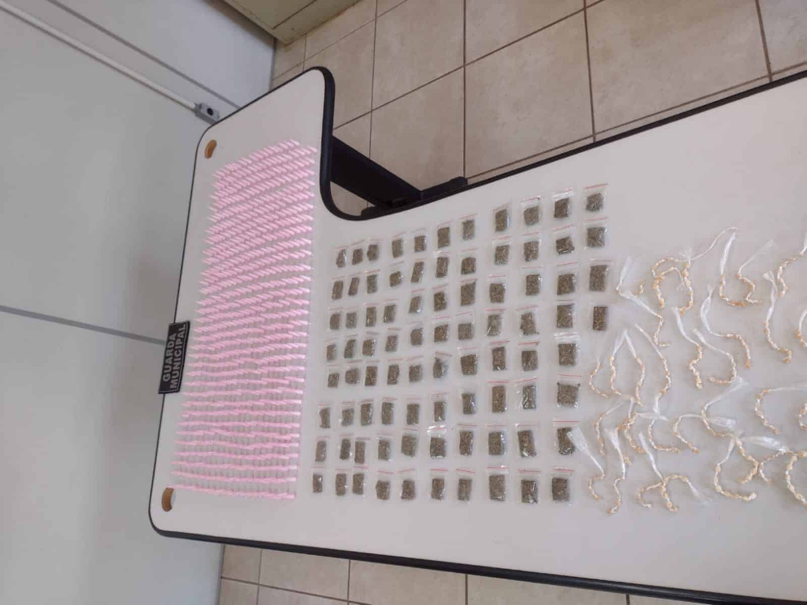 Próximo a motocicleta em uma sacola grande havia em seu interior 637 pinos de cocaína, 84 porções de maconha e 252 porções de crack. A ação contou com apoio do subinspetor Rogério e GCM Alves.