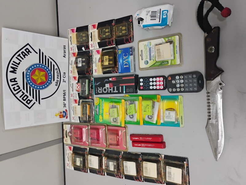 Após a ação, a Polícia Militar foi acionada via Copom e, de posse das características do criminoso, iniciou as buscas. Ele foi localizado a apenas um quarteirão do local do crime, carregando uma bolsa com todos os produtos furtados e a faca utilizada na ameaça.