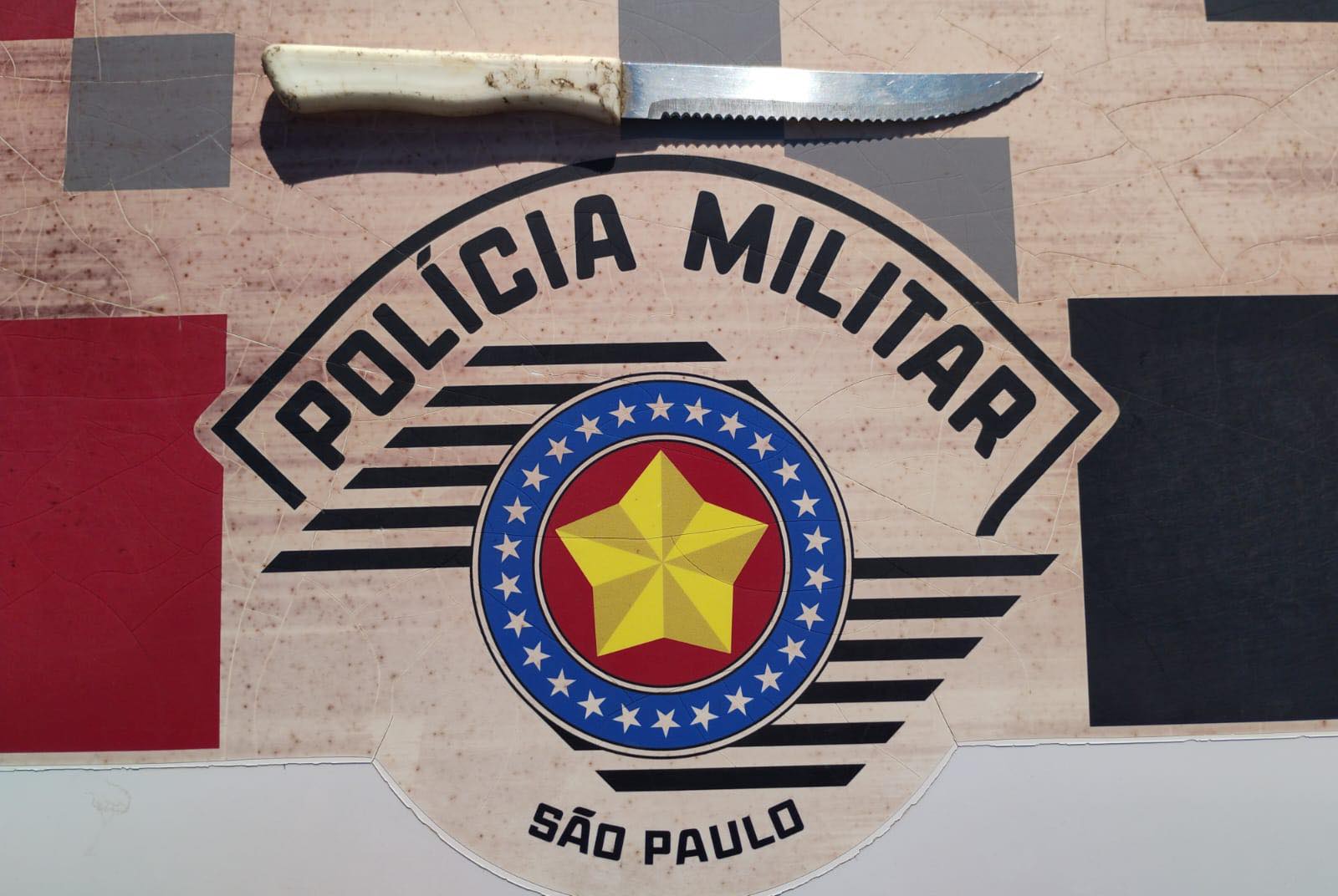 A Polícia Militar foi acionada via Copom e, ao chegar ao local, encontrou o suspeito com uma camisa enrolada na mão para esconder a arma branca. Ele foi imediatamente abordado.