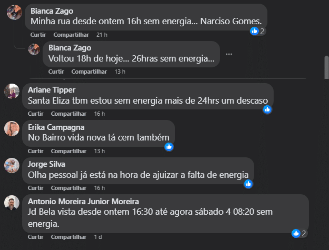 Após chuvas e ventos fortes atingirem Araras (SP) no final desta sexta-feira (3), moradores de diversos bairros relatam através das redes sociais falta de energia elétrica neste sábado (4), um dia após o temporal.