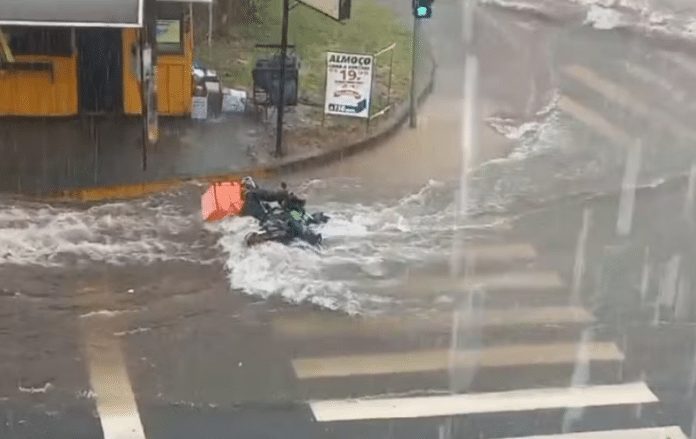 Imagens mostram que trabalhador tenta sair da via, mas motocicleta tomba com a força da água. Cidade registrou 15 mm de chuva em 40 minutos.