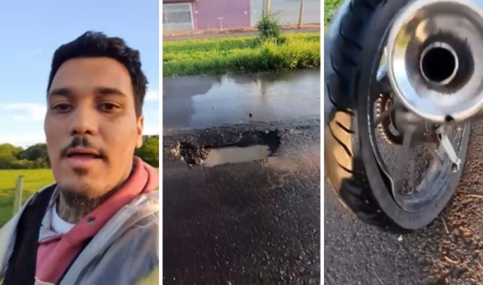 Ele descreveu a situação perigosa e a dificuldade em desviar do buraco: “Para os carros e motos que passam aqui, alguns conseguem desviar, outros não. Eu não consegui desviar. O buraco estava cheio de água, e logo antes de começar a gravar, um Celta branco passou direto por ele. Agora eu fico com esse prejuízo? Senhor prefeito, eu quero a reparação disso aqui. Não pague meus impostos à toa.”