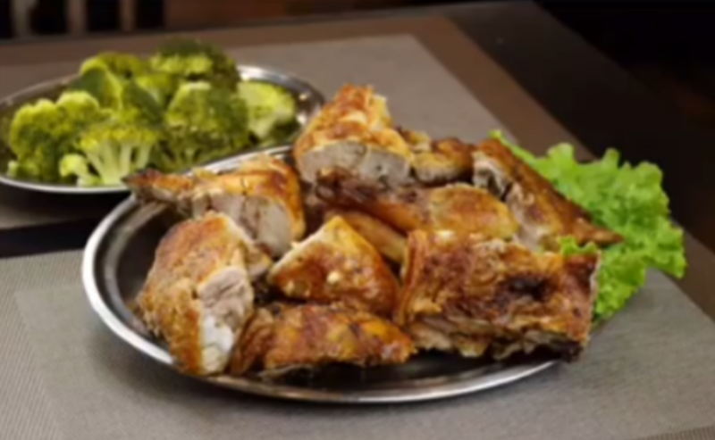 O cardápio inclui 1 frango inteiro com acompanhamentos, servido para duas pessoas, ao valor de R$ 100,00.