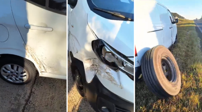 Na manhã desta quarta-feira (12), o pneu de um caminhão se soltou e atingiu dois veículos no km 163+500 da Rodovia Anhanguera (SP-330), no sentido interior, em frente ao Posto 7 Barão de Araras.
