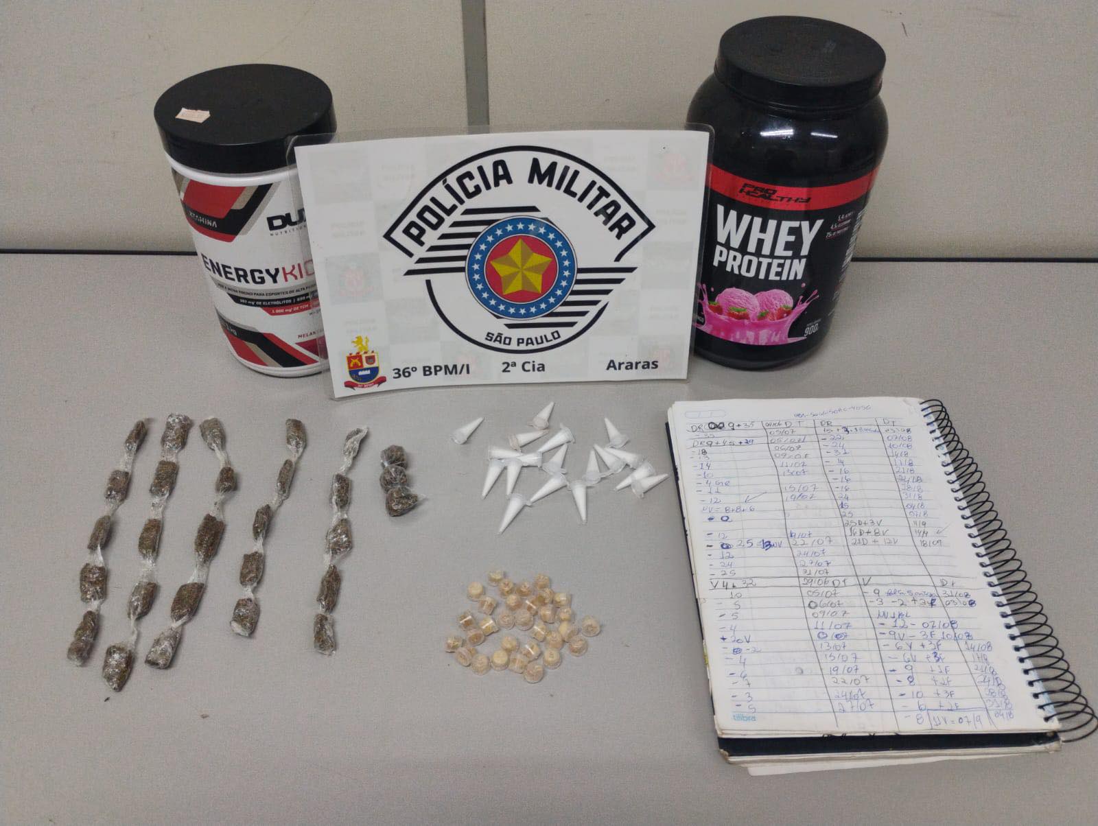 Dentro da sacola, os policiais encontraram 31 pedras de crack, 28 porções de maconha e 18 eppendorfs com cocaína, além de um caderno com anotações, notas fiscais e outros objetos.