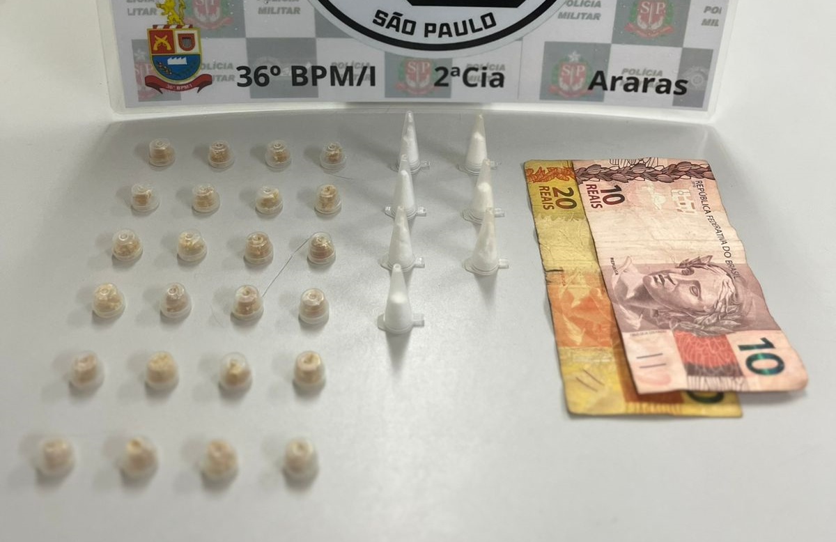 Ao perceber a aproximação da viatura, ele tentou fugir e dispensou uma sacola plástica ao chão. Na abordagem, os policiais encontraram 24 pedras de crack e 7 pinos de cocaína na sacola, além de R$ 30,00 em seu bolso.