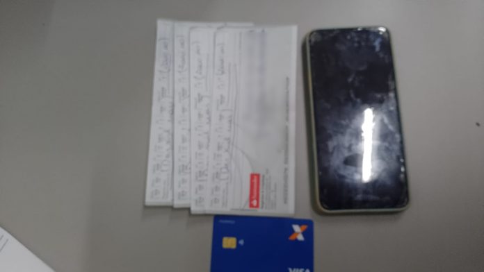 No local, a equipe detectou um indivíduo que havia passado duas folhas de cheque na caixa. Também foi detida uma mulher que estava do lado de fora com mais duas folhas de cheque na bolsa. Os cheques estavam preenchidos no valor de 2 mil reais cada.