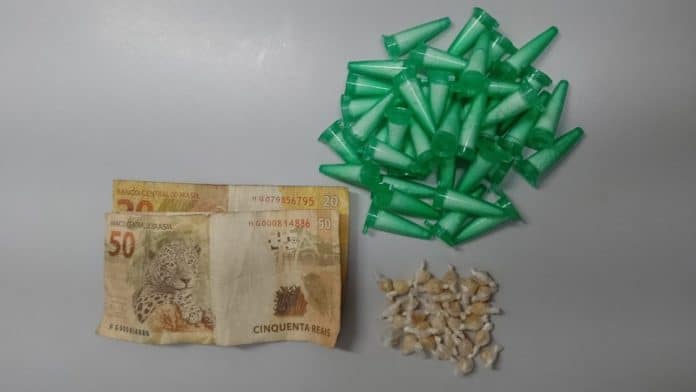Ao perceber que seria abordado o traficante de drogas jogou no chão 40 pinos de cocaína e 29 pedras de crack. Em revista pessoal, foi localizada a quantia de R$ 80,00. Com o usuário nada de ilícito foi encontrado.