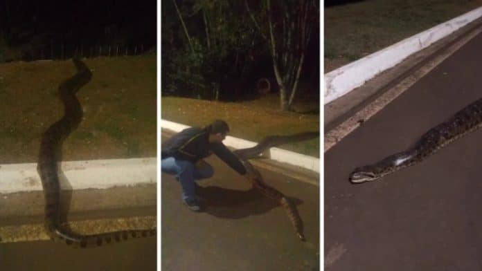 Uma enorme sucuri foi flagrada “passeando” na avenida que dá acesso ao Condomínio Residencial Lagoa e assustou moradores do local em Araras (SP) na quinta-feira (3). A moradora Tania Bernardo registrou a cena e se surpreendeu com o tamanho do animal.