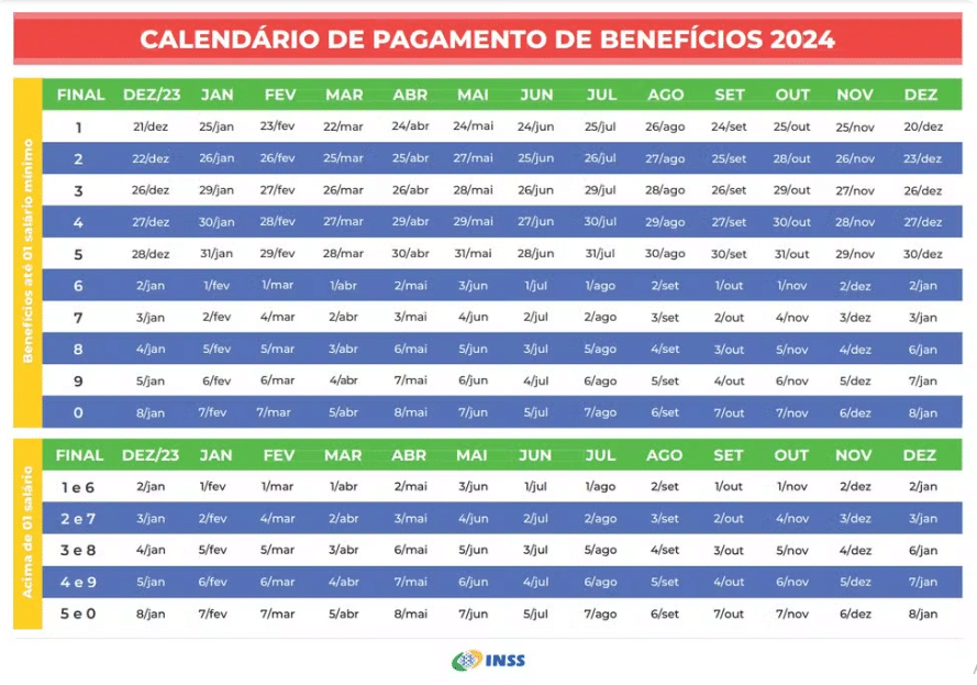 O calendário de pagamento a aposentados e pensionistas do INSS foi divulgado pelo instituto ainda no final de dezembro. O pagamento é feito de acordo com o último número do cartão do benefício, sem contar com o dígito verificador depois do traço.