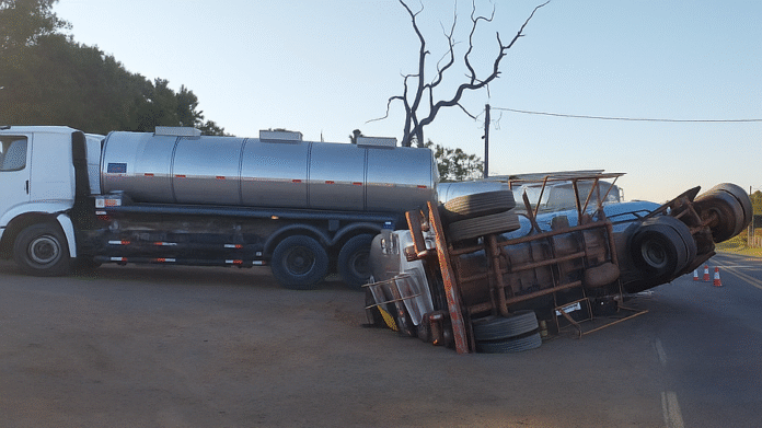 De acordo com o relato do próprio motorista, o veículo estava em uma empresa quando, ao realizar uma manobra de marcha à ré, o reboque acoplado ao semirreboque acabou tombando. A carreta transportava leite, e houve derramamento de aproximadamente 0,5 litro do produto. Apesar do susto, o condutor não se feriu.