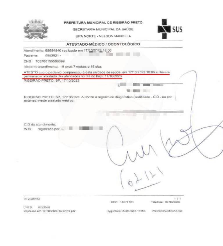 Devido a queda que o acusado sofreu durante a fuga, os Policiais socorreram ele até a UPA (Unidade de Pronto Atendimento) do mesmo bairro, e ao término do atendimento médico, o profissional da saúde deu um atestado médico, de um dia.