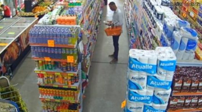 Conforme é possível ver pelas imagens, o “cliente” aparece com uma peça de carna na cesta. Em um determinado momento, acreditando que não estava sendo visto, coloca a carne dentro da calça.